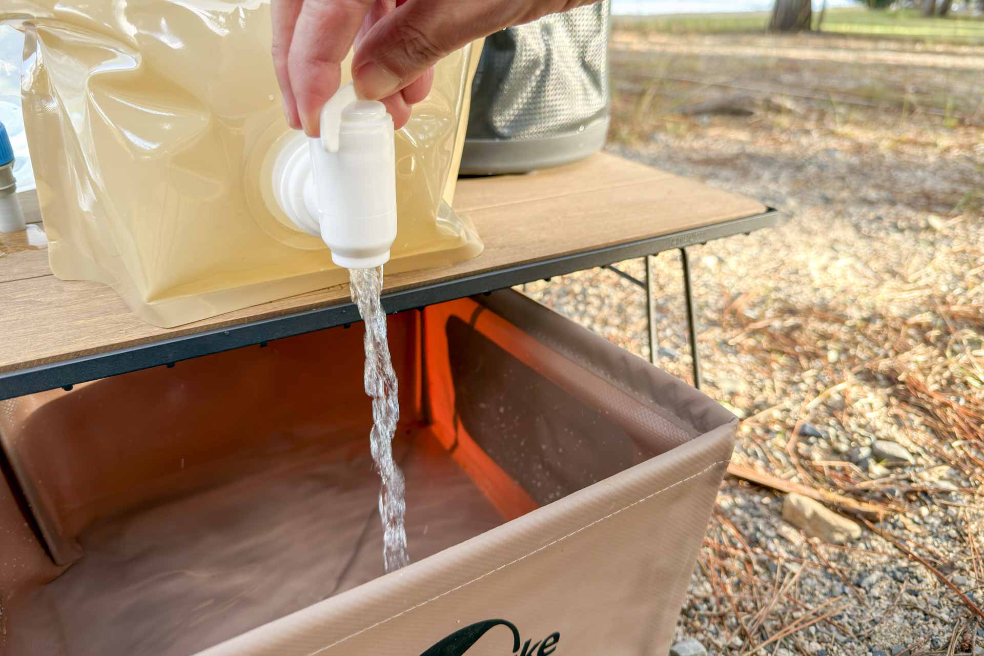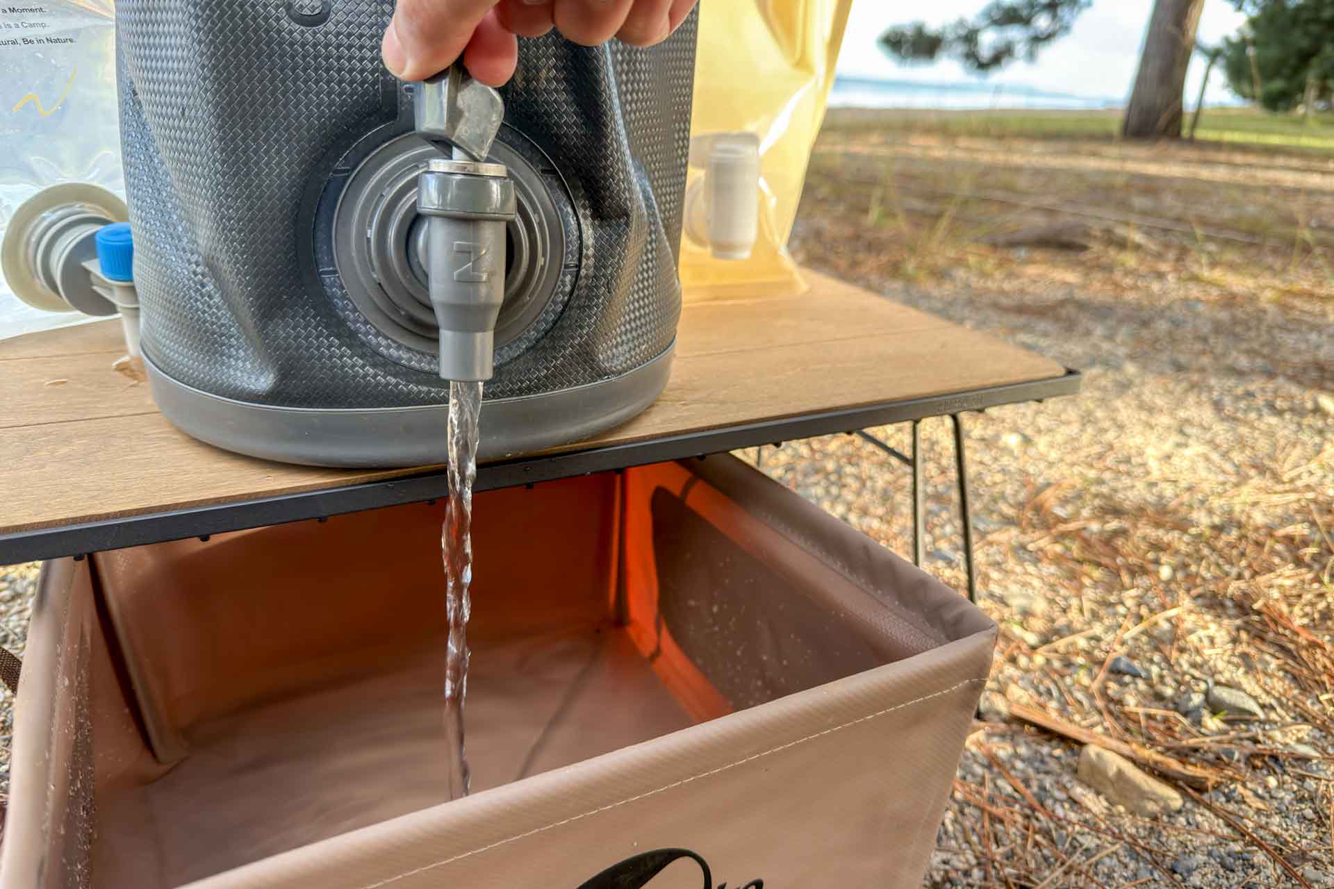 ところが!コンパクトに持ち運べるウォータージャグが登場しそれらを使い始めたところ、「水場が手元にある便利さ」に気づき、様々なウォータージャグを試すようになったのです(^^) とくにファミリーキャンプをする方は重宝すると思います!