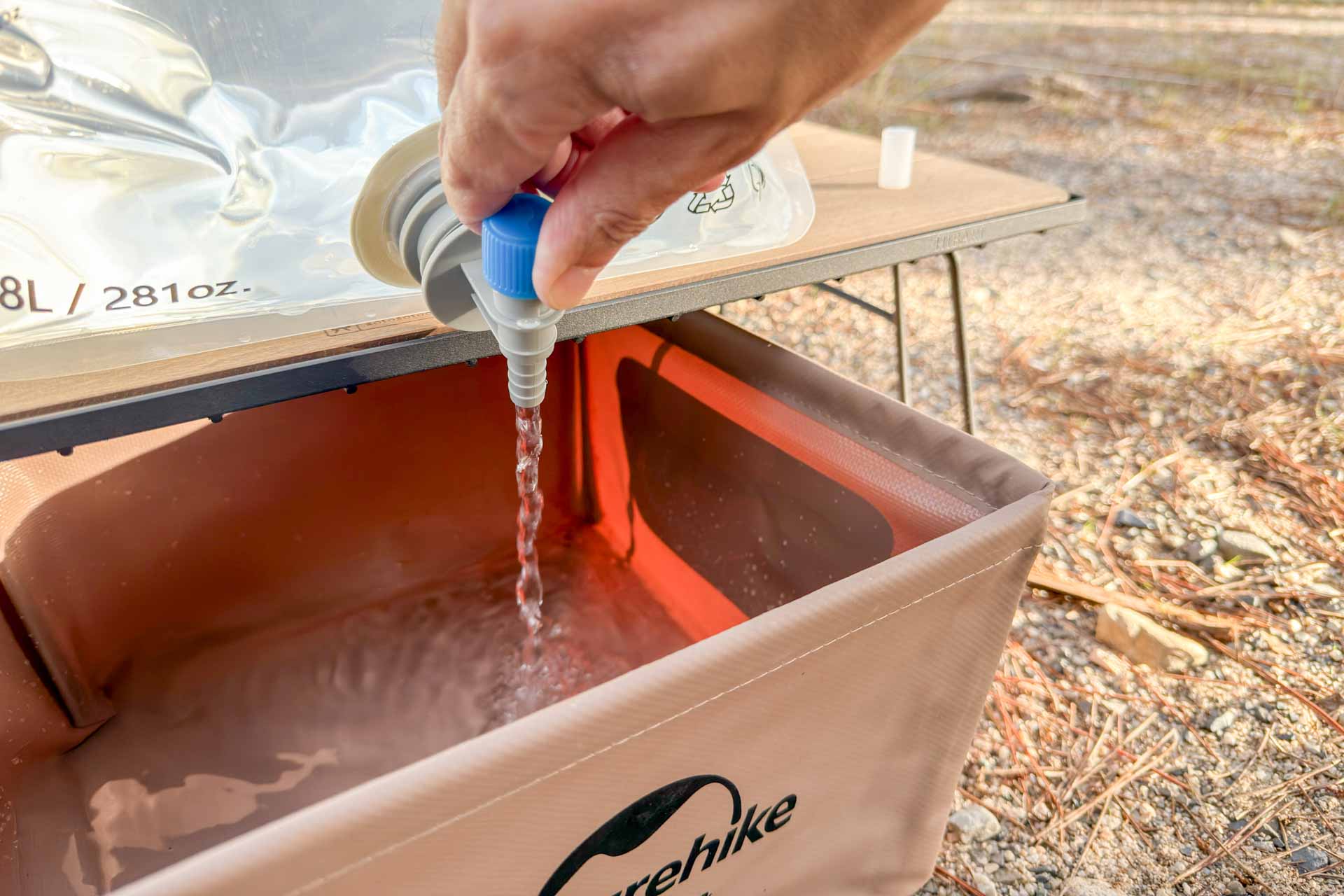 ZEN Campsは唯一、通常の水道のように蛇口を回して水量を調整するタイプを採用しています。水量も調整しやすいので良い面もあるのですが、青い回転部分が少し小さいので片手では回しづらさを感じる瞬間もありました。